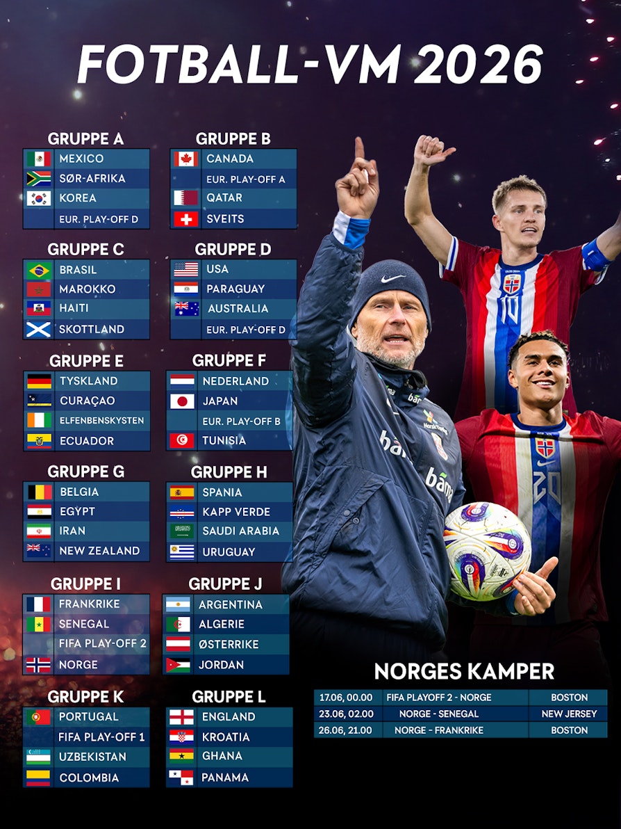 Fredag kveld norsk tid ble VM-trekningene endelig trukket. Norge havnet i gruppe I med Frankrike, Senegal og vinneren av Fifa-kvalifiseringen nummer 1: Irak, Bolivia eller Surinam.
